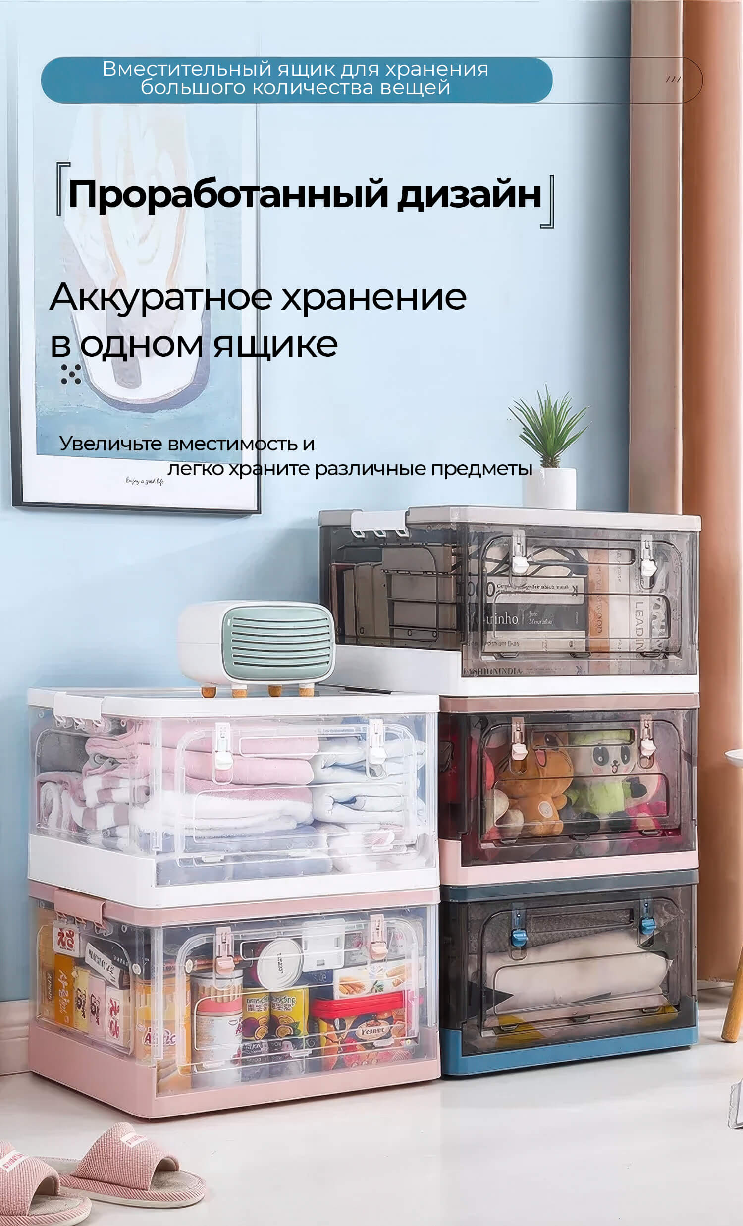 Пластиковая коробка с крышкой защищает вещи от пыли и влаги, а прочная конструкция обеспечивает долговечность даже при активном использовании. Колесики делают перемещение легким и удобным, а встроенная дверца на боковой стенке позволяет быстро получить доступ к содержимому, не снимая крышку. Складная конструкция экономит пространство, когда контейнер не используется.